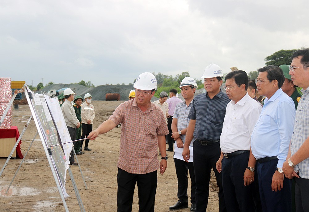 Bí thư Tỉnh ủy An Giang Nguyễn Tiến Hải, cùng đoàn công tác tỉnh kiểm tra tiến độ thi công Dự án thành phần 1, thuộc Dự án tuyến đường bộ cao tốc Châu Đốc - Cần Thơ - Sóc Trăng giai đoạn 1, đoạn qua địa phận tỉnh An Giang. Ảnh: baoangiang